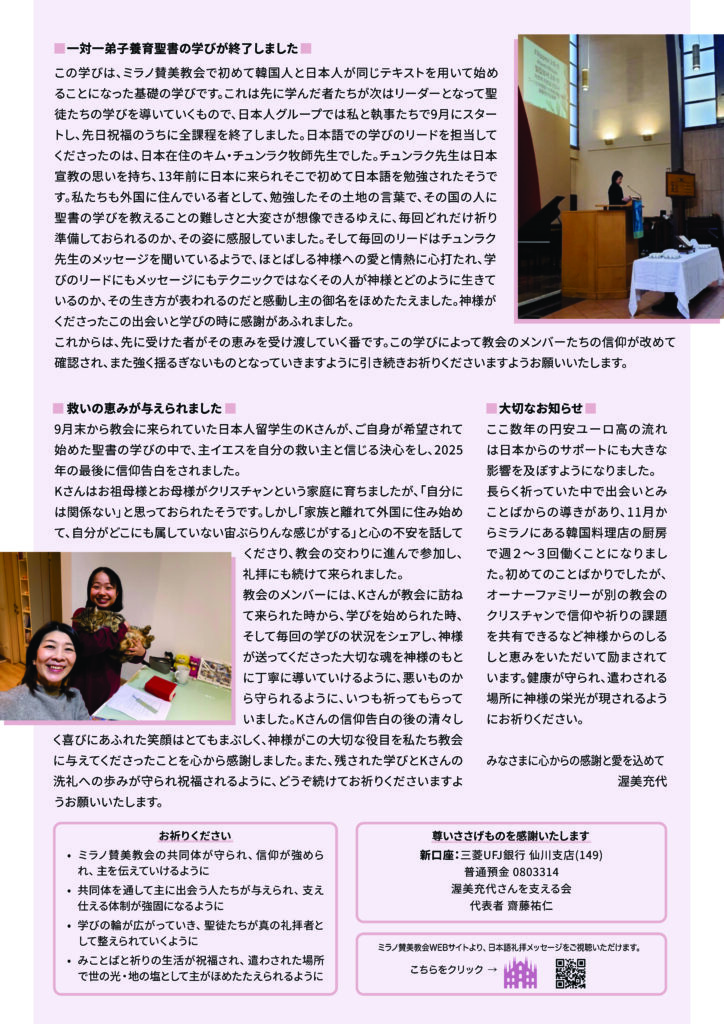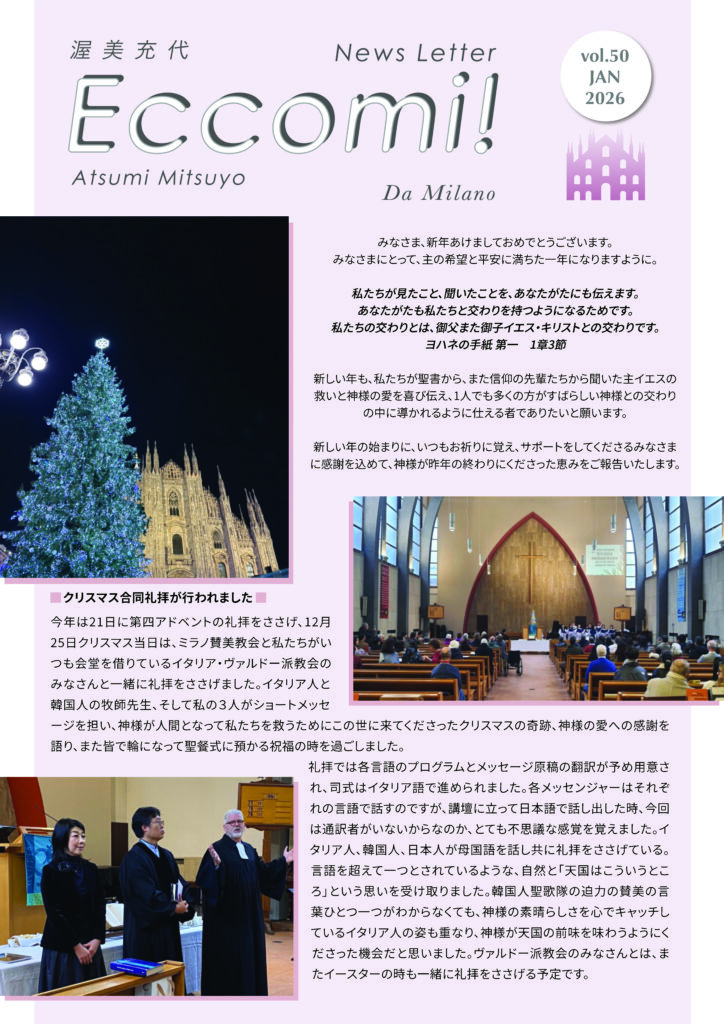 2026年1月版 ミラノ宣教レポート『Eccomi!渥美充代ニュースレター_vol.50』 記事の投稿日 1月 - 6 - 2026 ■PDF版(ミラノより渥美充代ニュースレター 2026年1月)はこちらからDL ■過去のミラノ宣教レポートはこちら カテゴリー: News, Slider, 海外宣教報告 オンライン献金はこちらから。 大きな額の献金は手数料の少ない口座振り込みをお勧めいたします。 Comments are closed.
