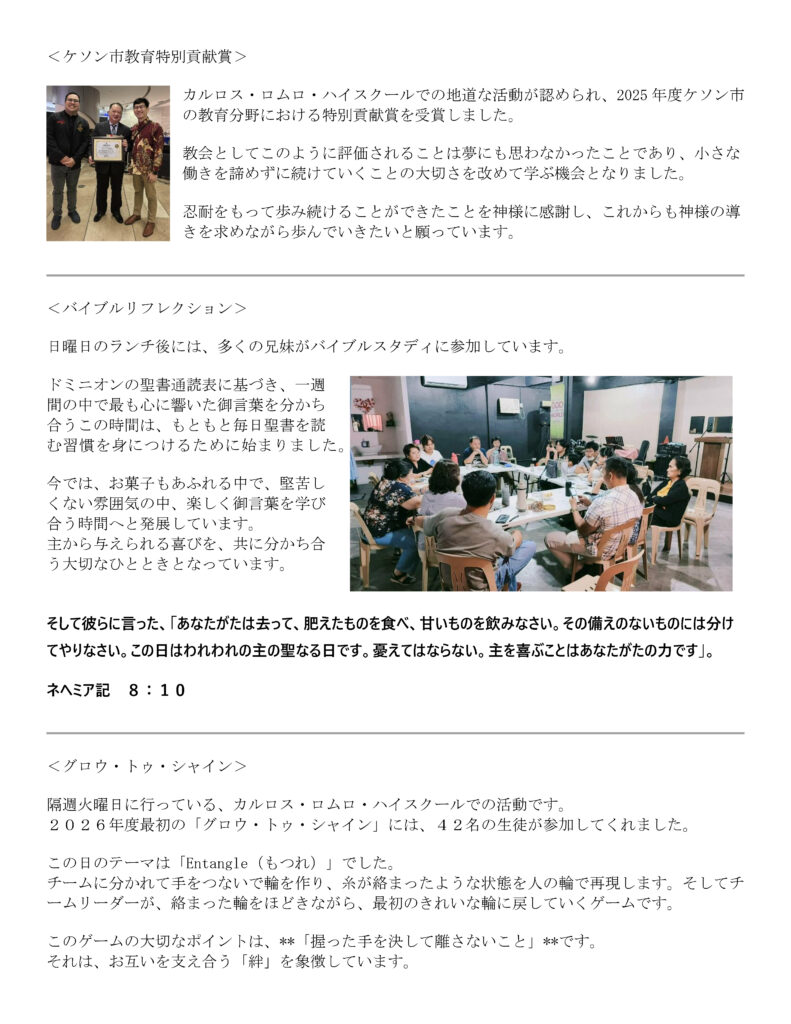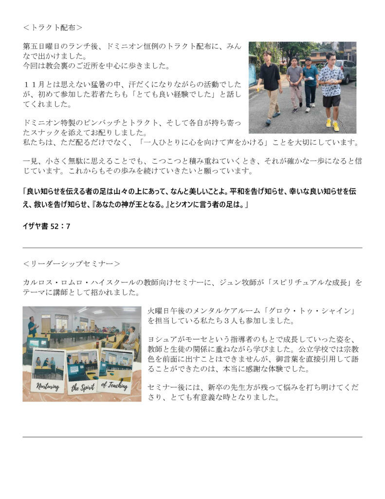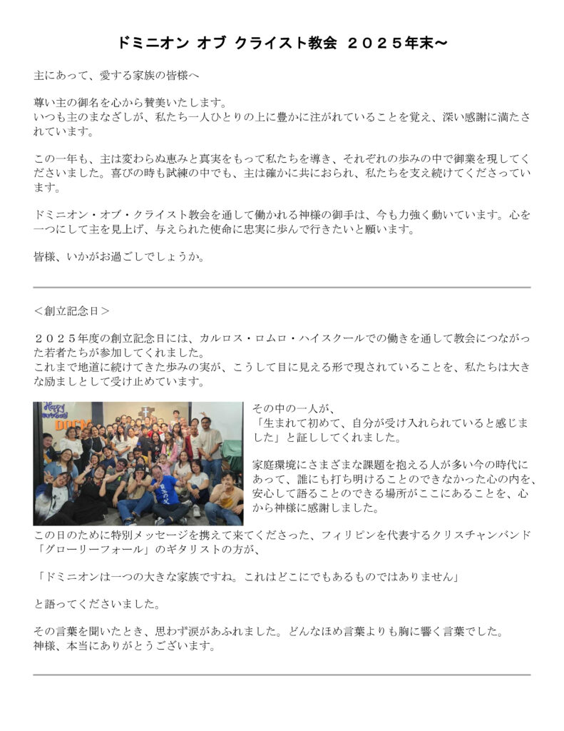 2026年ドミニオン・オブ・クライスト宣教レター 記事の投稿日 3月 - 29 - 2026 ■PDF版(2026年ドミニオン・オブ・クライストの宣教レター)はこちらからDL ■過去のドミニオン・オブ・クライストの宣教レターはこちら カテゴリー: News, Slider, レポート, 海外宣教報告 オンライン献金はこちらから。 大きな額の献金は手数料の少ない口座振り込みをお勧めいたします。 Comments are closed.